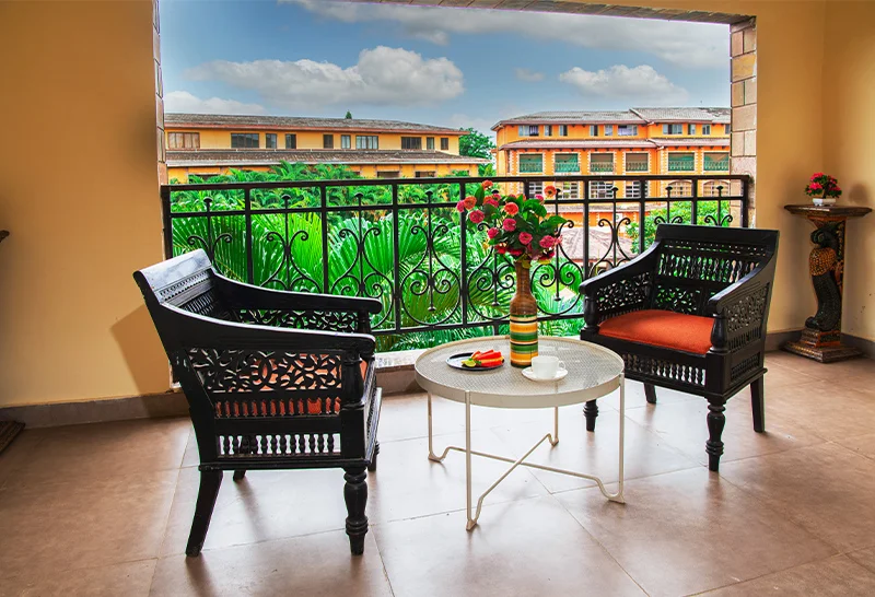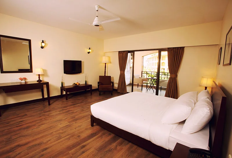 A stylish 500 sq ft retreat featuring two queen beds (or a queen + sofa‑cum‑bed/bunk bed), en‑suite bathtub, private balcony with French windows, and garden or pool views. Ideal for up to 4 guests, these air‑conditioned rooms balance elegance and comfort